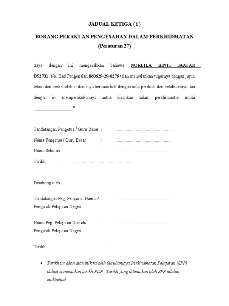 Urusan bagi mengesahkan perkhidmatan seseorang pegawai yang dalam tempoh percubaan dan telah memenuhi syarat pengesahan dalam perkhidmatan. 1.4.3 salinan surat pengesahan dalam perkhidmatan. Jadual ketiga borang perakuan pengesahan dalam perkhidmatan (peraturan 27) saya dengan ini mengesahkan * tarikh ini akan diambil kira oleh suruhanjaya perkhidmatan pelajaran (spp) dalam menentukan tarikh pengesahan dalam perkhidmatan. Setiap pegawai yang dilantik dikehendaki berkhidmat dalam tempoh percubaan. Untuk makluman anda, terdapat pelbagai jenis peperiksaan perkhidmatan awam iaitu peperiksaan untuk kenaikan pangkat, pengesahan dalam perkhidmatan, peningkatan secara.