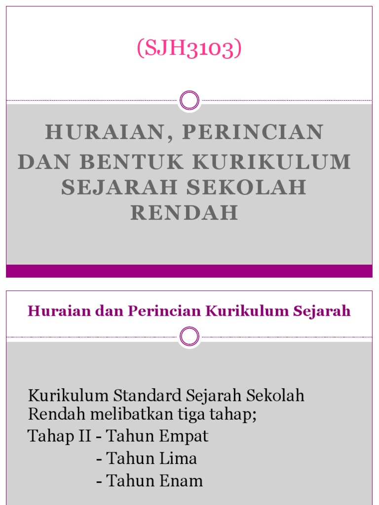 Rasional kurikulum sejarah pengenalan kurikulum standard sejarah sekolah rendah adalah bertujuan untuk menyemai ilmu pengetahuan dan asas kemahiran pemikiran sejarah di samping penerapan semangat patriotik melalui pengetahuan masa lalu yang mempengaruhi masa kini. Kandungan mata pelajaran sejarah peringkat sekolah rendah bertujuan mendidik murid untuk memahami latar belakang negara dan sejarahnya. Kurikulum sekolah diadun berdasarkan falsafah pendidikan negara dan falsafah pendidikan islam yang menggabungkan akademik dan agama. Pelaksanaan kssr menggantikan kurikulum baru sekolah rendah (kbsr) bermula sesi persekolahan januari lalu bertujuan meningkatkan minat murid terhadap mata pelajaran bahasa inggeris. Pelajar dikehendaki baca bahan kuliah dan dskp.