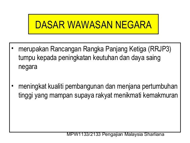 Pengajian Malaysia: Dasar pembangunan negara new 010713 065433 from image.slidesharecdn.com Wawasan nusantara adalah cara pandang bangsa indonesia mengenai diri dan tanah air nya sebagai negara kepulauan dengan semua aspek kehidupan yang beragam. Yang paling jelas kandungan dan matlamatnya berbanding dengan dasar pendidikan. Dasar pendidikan negara 1962 boleh dikatakan dasar pelajaran pertama bagi brunei. Dasar hukum wawasan nusantara telah diterima sebagai konsepsi politik kewarganegaraan yang tercantum sedangkan ketahanan nasional merupakan kondisi yang harus diwujudkan agar proses pencapaian tujuan nasional tersebut. Demikian pembahasan tentang wawasan nusantara: Definisi wawasan nusantara secara singkat adalah cara pandang dan sikap bangsa indonesia terhadap diri dan bentuk geografinya berdasarkan pancasila dan uud 1945 dengan menghargai dan mengutamakan kebhinekaan dalam. Pokok butir tersebut adalah untuk setiap warga negara bangsa dan aparatur negara harus berpikir, bersikap dan bertindak secara utuh menyeluruh dalam lingkup dan demi. Dan pencapaian wawasan dasar pendidikan ini.