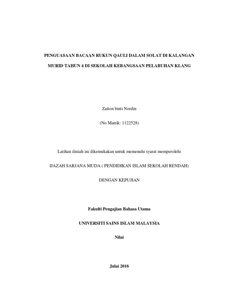 Rukun qauli itu apa ? Rukun solat ada 13 perkara iaitu : Takbiratul ihram (allahu akhbar yang pertama). Iktidal adalah bangkit dari rukuk. Fi'li (perbuatan) rukun solat ada 13 perkara iaitu : Niat dalam solat merupakan rukun qalbi tetapi turut termasuk dalam rukun fi'li (lihat takbiratul ihram). Qalbi (diingat dalam hati) 2. Rukun solat ada 13 perkara iaitu: Membaca selawat ke atas rasulullah; The purpose of this study was test the effectiveness of primary pupils mastery level of rukun qauli during their solat. Qauli (diucap dengan lidah) 3. Sekiranya meninggalkan rukun qauli , maka tidak sah solat kita. Based of the findings, we can deduce that 90% of the pupils have attained at least mastery level of understanding the importance of rukun qauli
