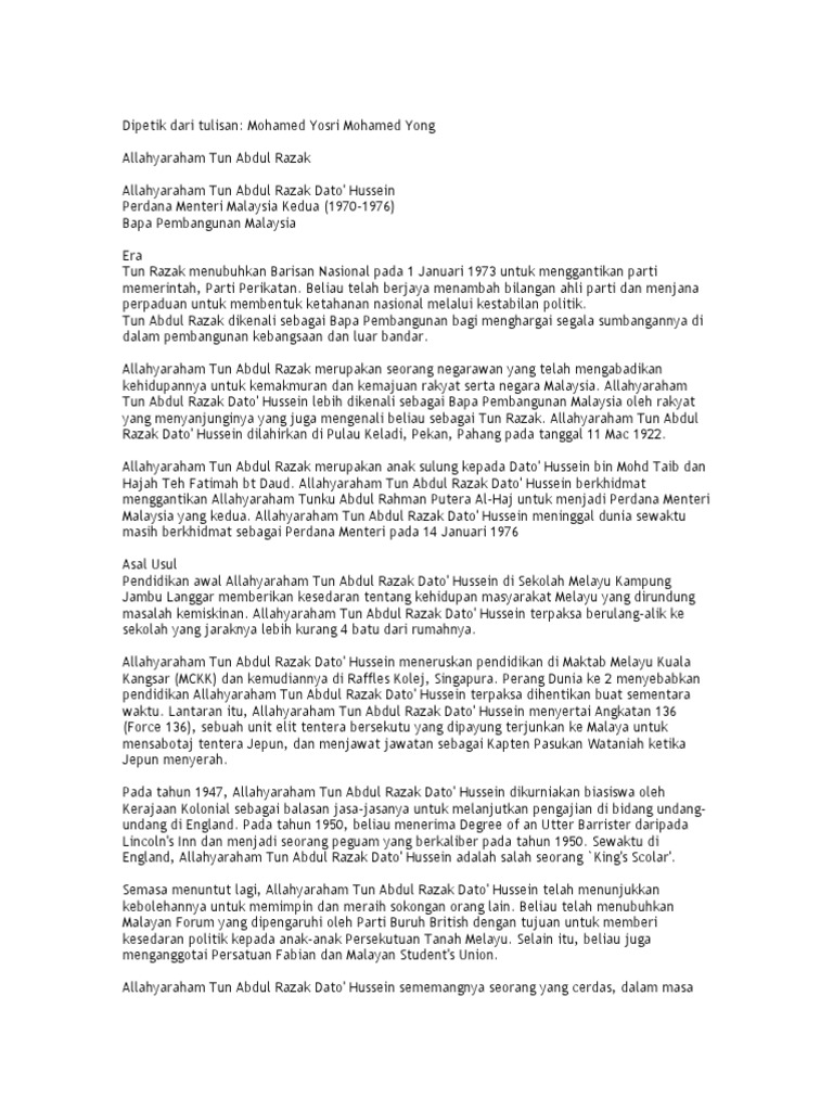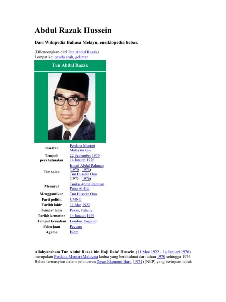 Tun abdul razak's the simple gentleman's items, the 2nd prime minister of malaysia in 60s & 70s für tun abdul razak memorial. عبدال رازک حسین) was the second prime minister of malaysia, ruling from 1970 to 1976. The documentary tells the untold story of one of malaysia's former prime minister, tun abdul razak, showcasing the legacy that he's left behind. Tun abdul razak bin dato' hussein atau tun abdul razak lebih dikenali sebagai bapa pembangunan malaysia oleh rakyat yang menyanjunginya kerana jasa dan sumbangan beliau untuk kemakmuran dan kemajuan rakyat serta negara malaysia. (15 jan 1976) the body of prime minister tun abdul razak arrives from london where he had been receiving medical treatment.