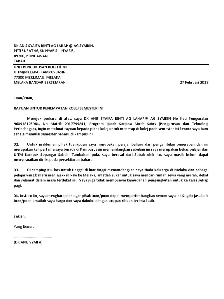 Pastikan anda telah mempunyai no slip bsn slip bsn 2. 3 mac 2012 (sabtu) masa : Portal kemasukan pelajar universiti teknologi mara. Contoh surat rasmi permohonan penangguhan pembayaran yuran via komedatlendu.blogspot.com. Soalan esei sejarah zaman gelap; Rayuan pemohonan kolej (ijazah) via www.kedah.uitm.edu.my. For more information and source, see on this link : Pelajar nr dan pelajar yang gagal dalam permohonan kolej boleh membuat rayuan selepas 15 september 2014. Contoh surat rasmi permohonan penangguhan pembayaran yuran via komedatlendu.blogspot.my. Related posts to surat rasmi rayuan kolej kediaman uitm surat rasmi rayuan kolej kediaman uitm 2018 04 25t10 20 00 07 00 rating. Contoh surat rayuan menduduki kolej uitm kuora v cute766. Unit pengurusan kolej dan nr uitm arau, perlis borang permohonan rayuan kemudahan kolej kediaman permohonan penempatan untuk sesi: Contoh surat rayuan kolej uitm.
